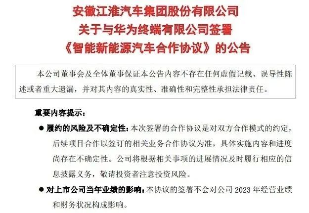 今年12月1日,江淮汽车发布公告,其与华为终端签署合作协议,将与华为终端强强联合,基于华为智能汽车解决方案,在产品开发、生产制造、销售、服务等多个领域全面合作,着力打造豪华智能网联电动汽车。