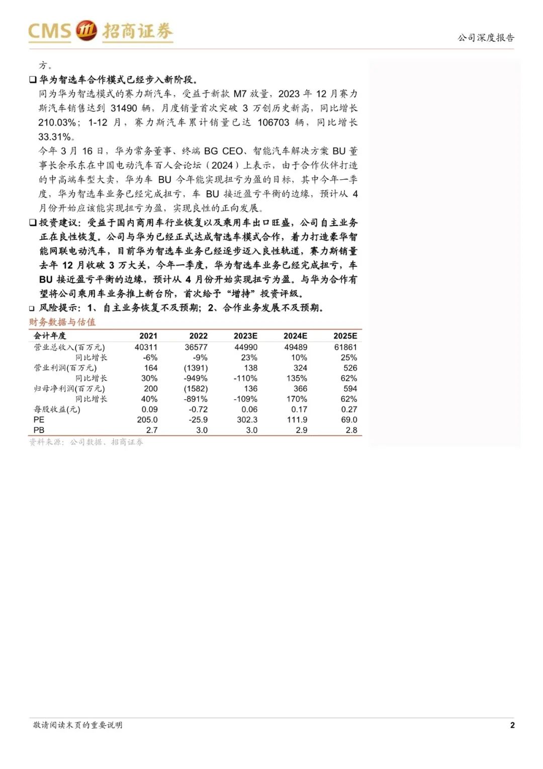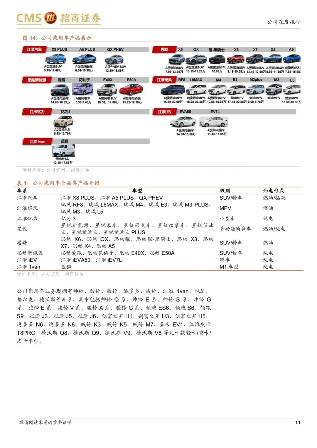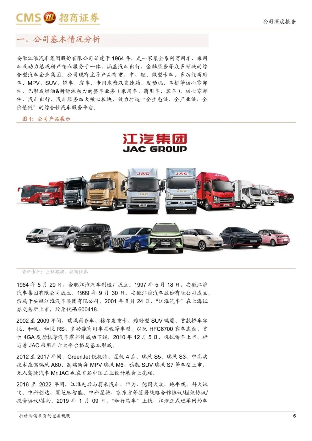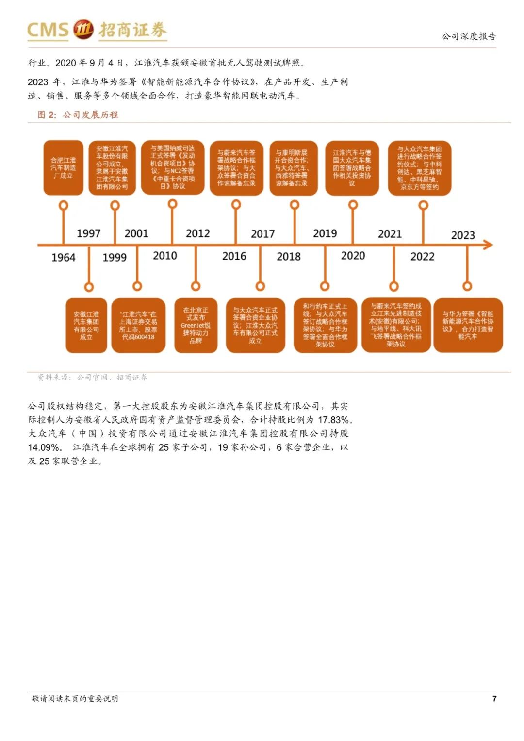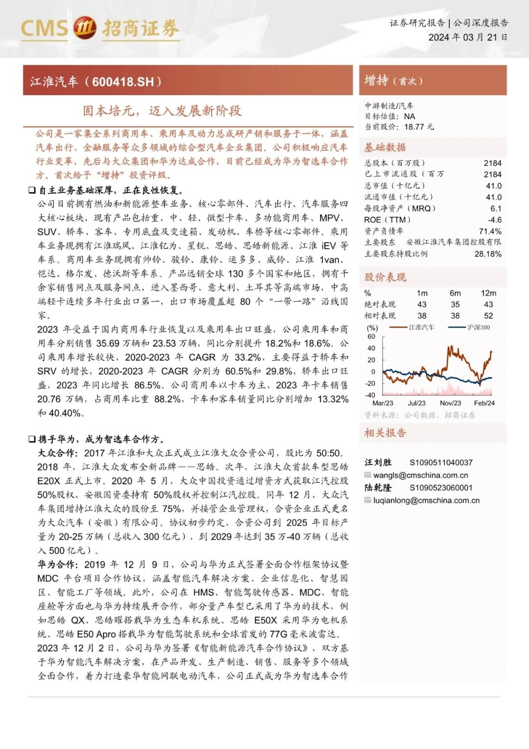 江淮汽车是一家集全系列商用车、乘用车及动力总成研产销和服务于一体,涵盖汽车出行、金融服务等众多领域的综合型汽车企业集团。公司积极响应汽车行业变革,先后与大众集团和华为达成合作,目前已经成为华为智选车合作方。
