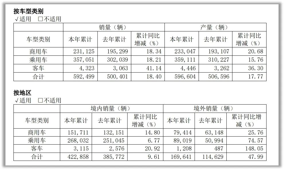 2023年,江淮抢抓国际市场机遇,全年销量为59.25万辆,同比增长18.40%,主营业务毛利率提升3.00%。其中,全年境外销量累计16.96万辆,同比增长47.99%;尤其是乘用车的境外销量超过了74.00%(图5)。