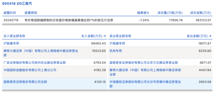 7月19日,江淮汽车今日跌7.07%,龙虎榜数据显示,上榜营业部席位全天成交12.53亿元,占当日总成交金额比例为34.5%。其中,买入金额为8.71亿元,卖出金额为3.82亿元,合计净买入4.89亿元。