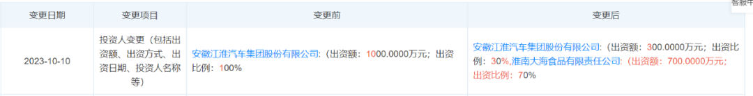 但信息显示,5个月后的同年10月,江淮汽车已将江汽进出口70%的股权出售给了淮南大海食品有限责任公司,失去控股权,负责人也由贺涛变更为了贾娜。