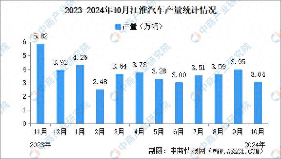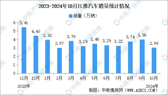 2024年10月,江淮汽车产量3.04万辆,同比减少21.37%。销量2.99万辆,同比增长20.15%。2024年1-10月,江淮汽车累计产量34.45万辆,同比减少7.72%。累计销量34.52万辆,同比减少6.28%。
