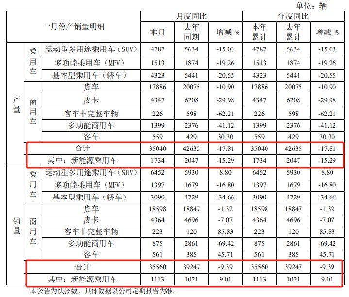 江淮汽车(600418)2月10日公告,2025年1月销量为3.56万辆,同比下降9.39%;产量为3.5万辆,同比下降17.81%。其中,新能源乘用车1月销量为1113辆,同比增长9.01%;产量为1734辆,同比下降15.29%。