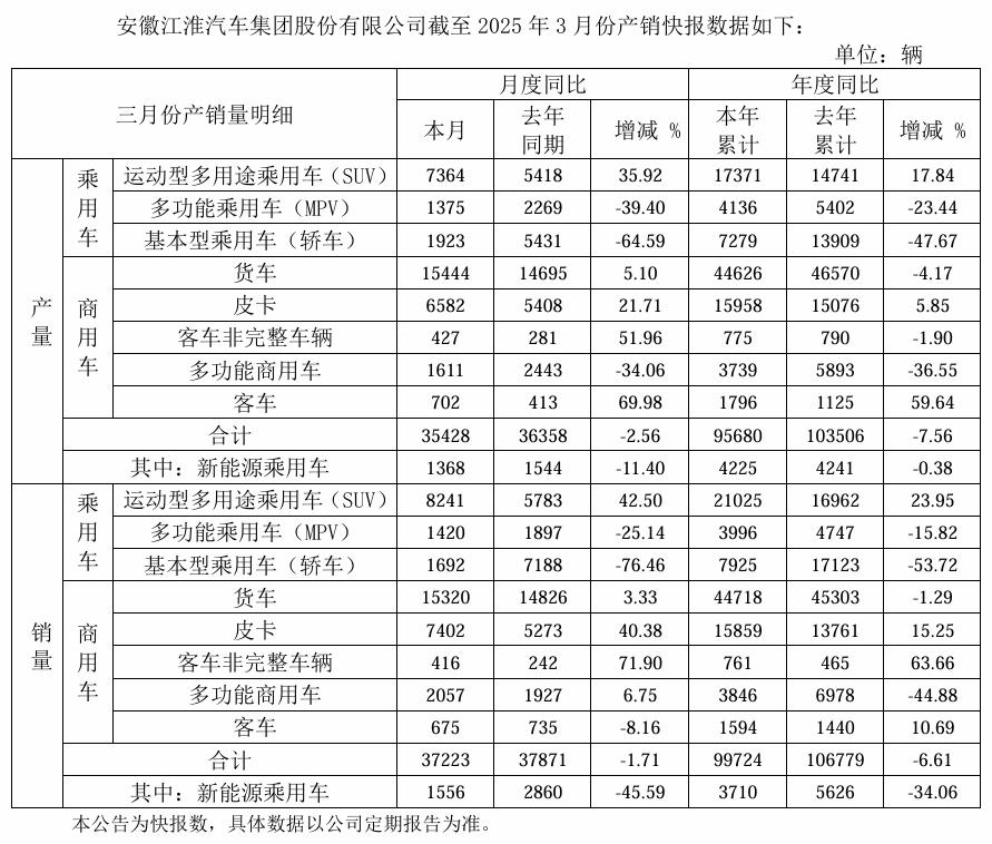 江淮汽车今日发布 2025 年 3 月产销快报,3 月产量 35428 辆,同比减少 2.56%;3 月销量 37223 辆,同比减少 1.71%。