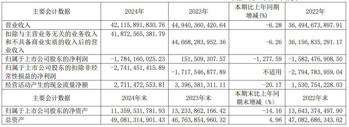 近期,江淮汽车发布2024年业绩报道,去年公司实现营业收入421.16亿元,同比下降6.28%;归属于上市公司股东的净利润-17.84亿元,同比下降1,277.59%。