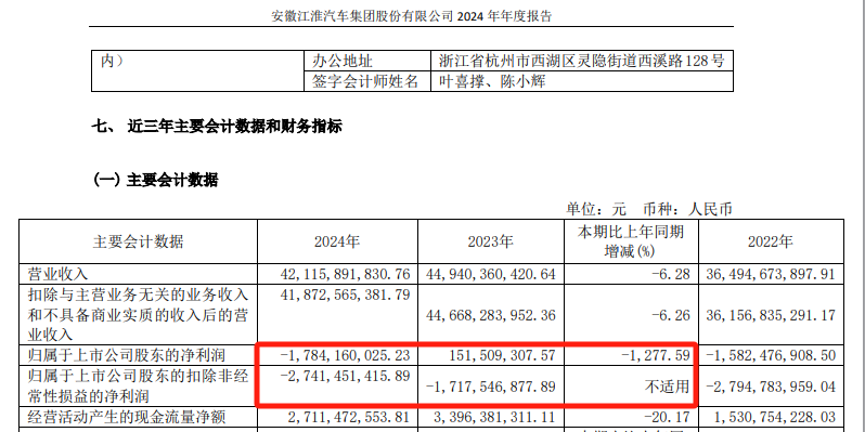2024年,江淮汽车的营业收入为421.16亿元,同比下降6.28%;归母净利润为-17.84亿元,同比由盈转亏。