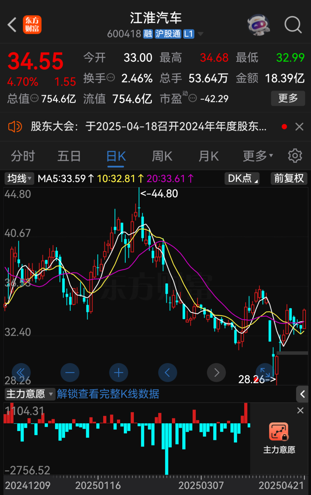 截至4月21日收盘,江淮汽车股价报34.55元/股,涨幅达4.7%,总市值为754.6亿元。