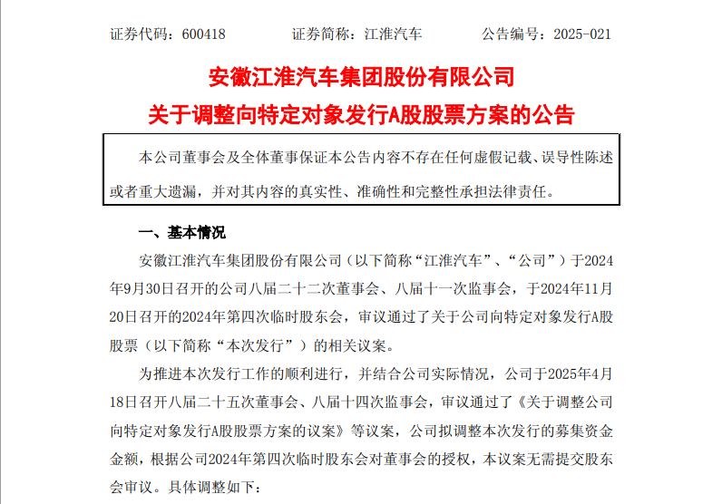 江淮汽车公告称,公司调整募资金额,是为了使定增工作顺利进行,并结合公司实际情况。