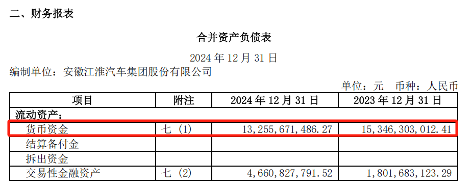 截至2024年12月31日,江淮汽车拥有的货币资金为132.56亿元,同比下降13.81%。
