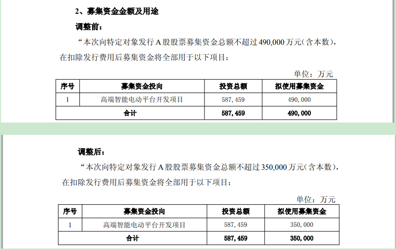 公告显示,由于调整了定增募资金额,江淮汽车拟使用的募集资金由49亿元变为35亿元,但募投项目的投资总额仍为58.75亿元。