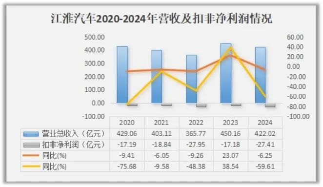 2024年财报显示,江淮汽车营收为422.02亿元,同比下降6.25%;扣非归母净利润从前年的亏损17.18亿元大幅扩大至去年的亏损27.41亿元。