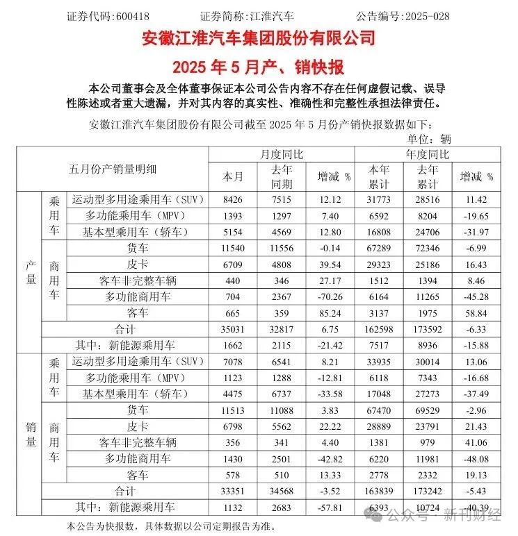 6月9日盘后,江淮汽车(600418.SH)披露的5月产销数据显示,其当月汽车销量为3.34万辆,同比下滑3.52%,其中新能源乘用车销量仅1132辆,同比降幅达57.81%。1-5月累计销量16.38万辆,同比下降5.43%,新能源乘用车累计销量6393辆,同比大幅下滑40.39%。
