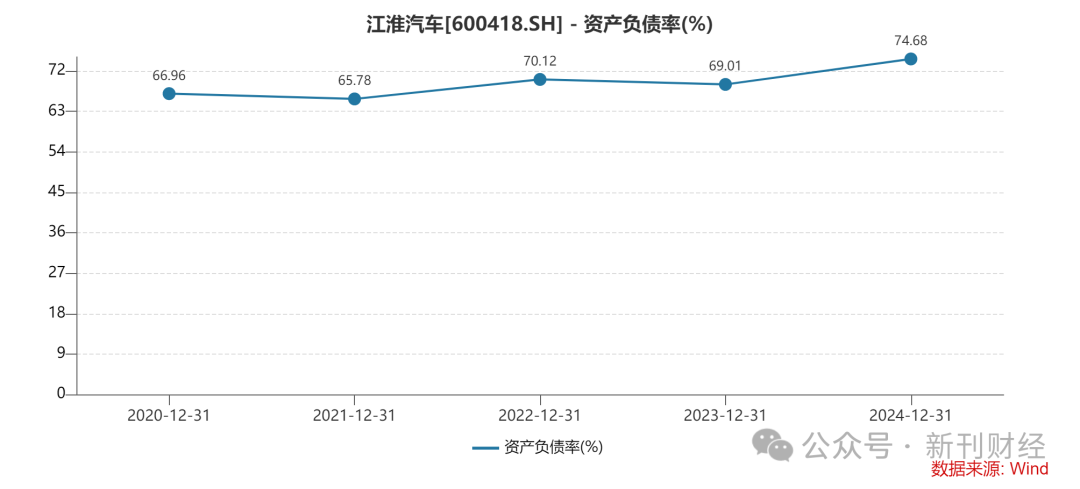 数据显示,江淮汽车资产负债率近五年持续攀升,截至2024年末已达74.68%,创上市以来历史峰值。在资产结构层面,截至2024年底,其应收账款与预付款项合计35.11亿元,而应付账款、应付票据及合同负债总额高达226.54亿元,无息负债相对较高。尽管表面呈现对上下游资金的强势占用,但供应商账期过度拉长或已埋下供应链隐患,一旦核心供应商收紧信用政策,其流动性风险将陡然加剧。