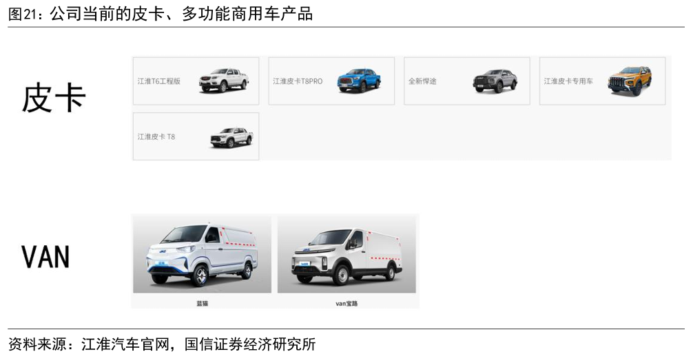公司的传统业务可分为:乘用车、商用车、客车以及底盘,其中以商用车、乘用车为主。商用车业务主要由旗下的轻型商务车分公司、重型商务车分公司与江淮专用车负责,核心产品包括轻中卡、皮卡、多功能商用车(Van)。乘用车业务主要由旗下的乘用车制造事业部与商务车分公司负责,产品有瑞风系列MPV、自有品牌SUV、江淮钇为等。客车业务主要由江淮客车与子公司安凯股份负责。底盘业务主要由江淮铸造负责。公司其他重要分部还有发动机分公司、江汽进出口、江汽物流等。