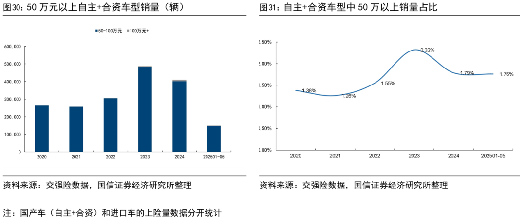 50万元以上的国产豪车市场,随着消费升级、自主替代和进口车型国产化,市场规模扩容,但随着价格战和部分豪车定价下沉,近两年占比在下滑。2023年及以前,国产豪车销量显著增长,50万元以上车型销量从2020年的26.33辆,增长到2023年的48.68万辆;当时,50万元以上自主豪车尚未发力,消费升级趋势带动了50万元以上销量的增长,此外宝马X5等原进口豪车在2022年之后国产化,助力了国产豪车销量的增长。2024年,随着价格战的推进,以及自主品牌豪车的竞争,部分豪车车型或SKU如奥迪A6等指导价下沉至50万以下,导致50万元以上销量降低。此外,由于56E等车型终端折扣巨大,部分售价50万元以上的车型或SKU实际成交价在50万以下。占比方面,国产车型中,50万元以上车型销量占比在2023年达到高点2.32%,2025年1-5月,占比为1.76%。其中100万元以上的自主/合资车型在2024年销量2.7万辆,但2025年1-5月仅为2402辆。