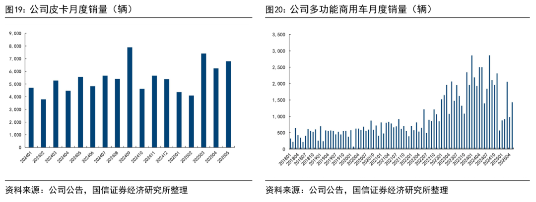 公司在商用车领域发力皮卡业务,实现扩品类,多功能商用车也在2023/2024年明显增长。公司在2023年开始发力皮卡业务,2024年起开始实现一定规模销量,皮卡业务全年实现6.3万辆销量;2025年3月后,皮卡月销显著提升。公司布局多功能商用车(VAN)业务较早,但在2022年以前销量规模较低;为应对复杂变化的轻卡市场,公司VAN业务在2022年下半年发力,销量显著提升。