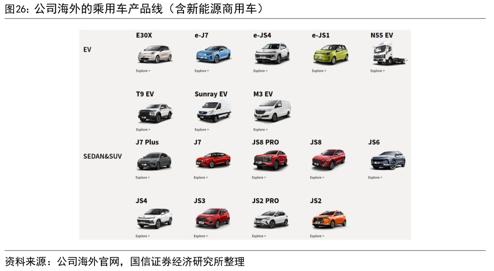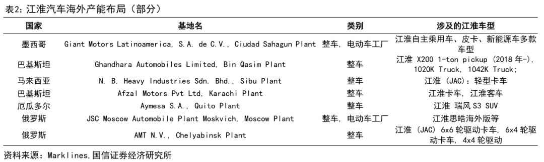 公司广泛布局海外产能,为近年海外业务高速增长筑基。公司通过自建、合作等模式布局多个海外工厂或KD工厂,产能覆盖拉美、欧洲、南亚、东南亚,车型覆盖卡车、皮卡、客车、燃油乘用车、新能源乘用车多种车型。