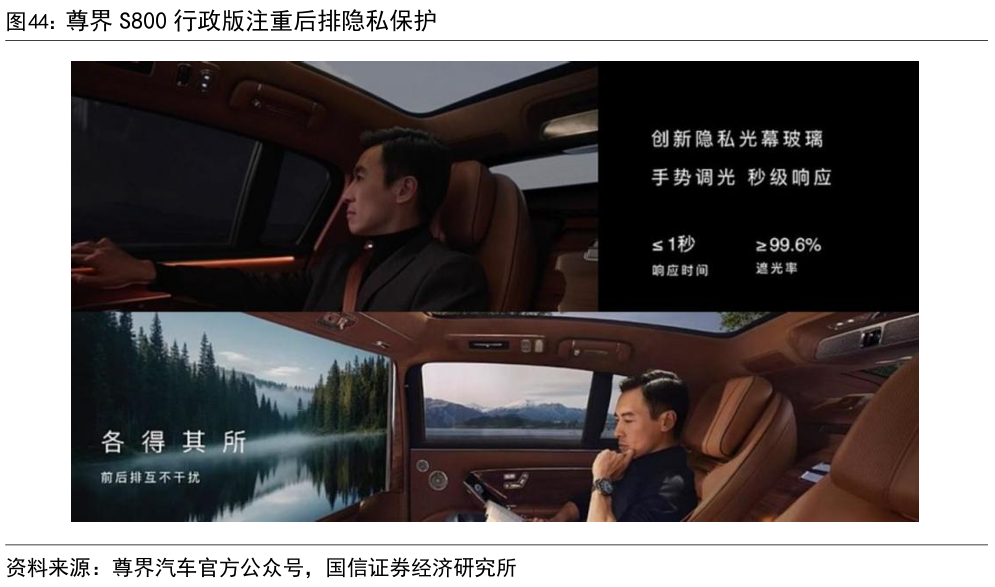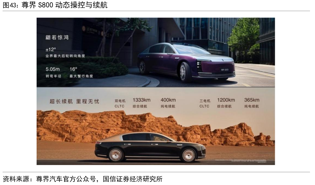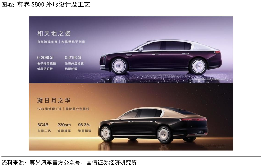 50万元以上的乘用车市场,国产车(自主品牌+合资品牌)和进口车都占据着重要的份额;但其中国产车除了宝马X5以外,几乎集中均价在60万元以下的豪车市场;价格中枢在70万元以上的进口车有一定销量规模。超豪车赛道目前以进口车为核心,属于自主品牌蓝海市场。鸿蒙智行凭借问界M9在高端豪车市场取得成功,进入超豪华赛道具备一定优势。公司与华为合作的尊界系列首款车型S800于2025年5月30日正式上市,尊界S800产品力强,配置和细节有诸多亮点,上市首月大定突破6500台。
