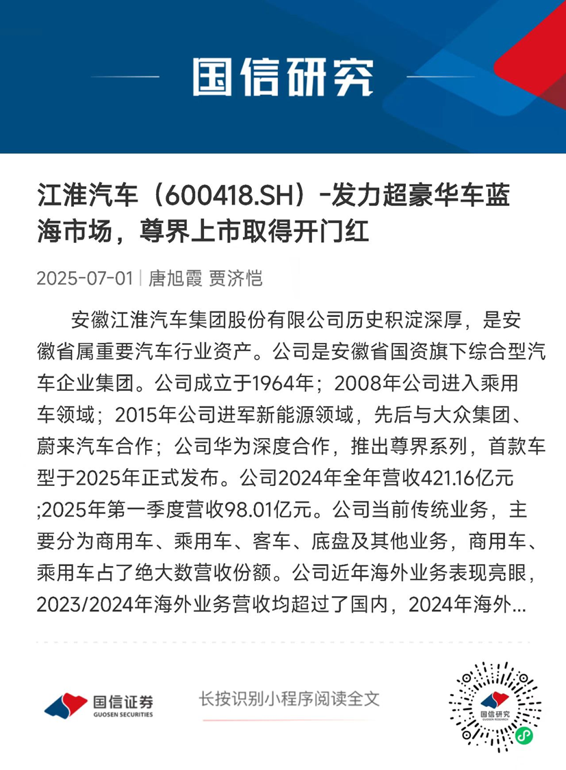 详细内容请见国信证券汽车团队2025年7月1日发布的深度报告《江淮汽车(600418.SH)-发力超豪华车蓝海市场,尊界上市取得开门红》