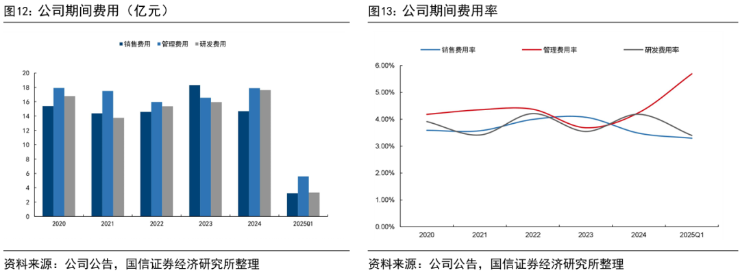公司研发、管理、销售三大费用相对平衡,其中管理费用率在2025年有明显上升。2024年,公司销售、管理、研发费用分别为14.67/17.89/17.63亿元,对应费用率分别为3.48%/4.25%/4.19%。纵向来看,管理费用率相对稳定,2024年数据与近年平均水平相似;销售费用有所下滑,反应了公司资源向尊界倾斜的现状;研发费用在2024年有所提升,公司处于相对高投入阶段。2025年第一季度,销售、研发费用率有所下滑,管理费用率有明显的提升,达到了5.69%。