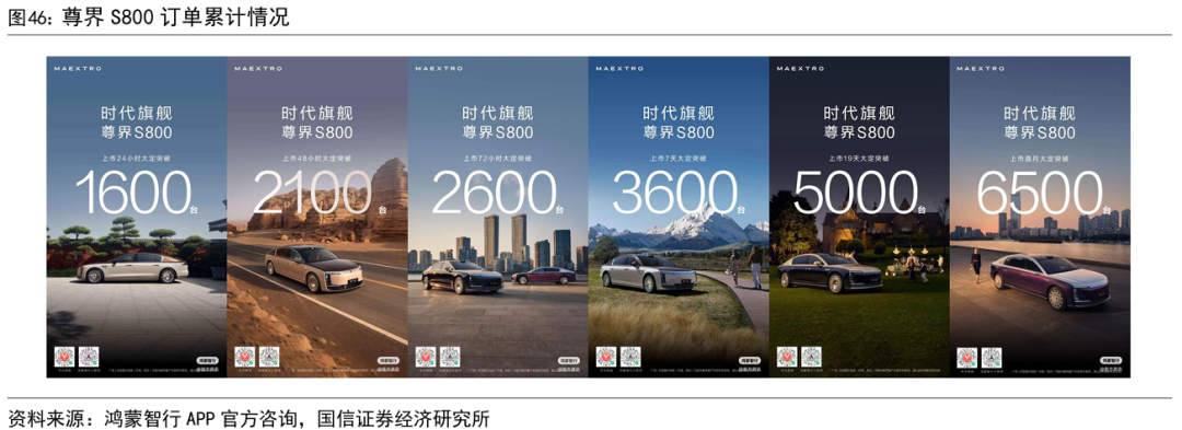 尊界S800上市首月大定突破6500台,取得开门红。尊界S800上市取得较高市场关注,终端热度持续。上市首日获得1600台大定,后续订单持续累计,至2025年6月17日,鸿蒙智行官方宣布尊界S800上市19日大定突破5000台,日均达到了263台;其中第7日到第19日,日均新增订单保持在117台左右,成绩不俗;至6月30日,鸿蒙智行官宣S800首月订单突破6000台,第19至首月,日均订单保持稳定。截止6500台订单公告日,尊界S800尚未批量交付,在先行版交付以及批量交付之后,需考察车主口碑发酵情况,判断未来稳态订单。