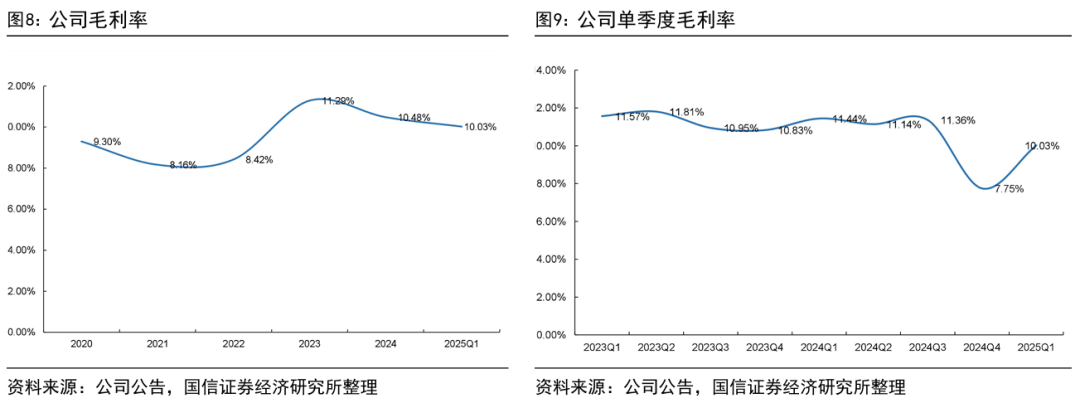 公司2024年毛利率为10.48%,2025年第一季度毛利率为10.03%。公司在商用车尤其是轻中卡行业低迷情况下,兼顾乘用车业务转型的同时,积极探索海外业务机会,在2023/2024年转型期实现了毛利率的整体提升。公司在2021年毛利率达到近年的地点8.16%,随着海外业务的提升,2023年达到11.29%,2024年和2025年第一季度有所下滑,但仍在10%以上。