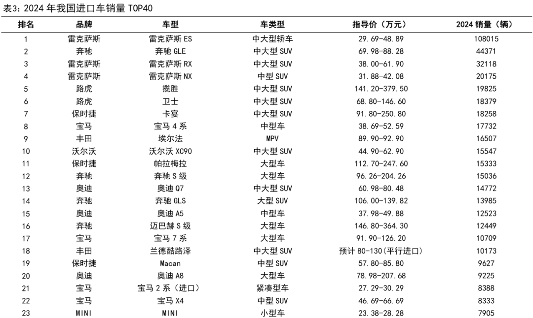 根据易车网数据,以及车媒指导价信息,2024年销量前40的进口车型,大多数价格中位在50万元以上;而价格中位数处于50-100万元的热销车型中,大多数销量来自于中位数70万以上车型。根据易车网整理的2024年进口车型前40排名,前40进口车型共计有54.24万辆销量;价格中枢在50万元以上车型占了其中的30个,合计销量超32万辆;价格中枢在50-100万元的车型有15个,合计销量15.09万辆,其中价格中枢在70-100万元的车型5个,合计销量8.87万辆;价格中枢在100万元以上车型15个,合计销量16.94万辆。