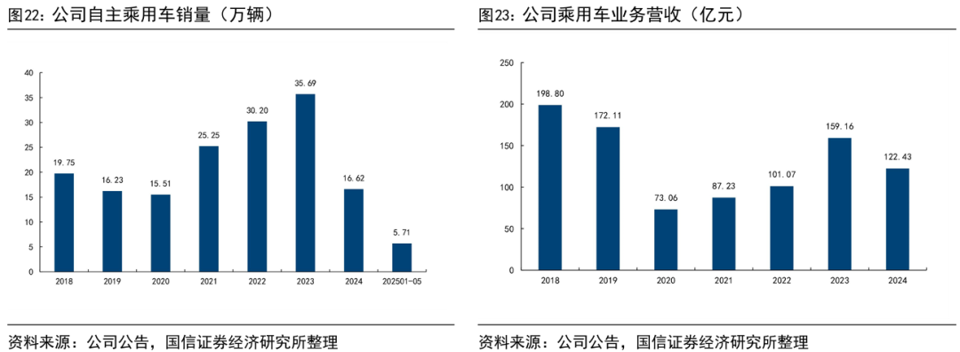 公司商用车业务营收和产品销量在2023/2024年回升,核心产品线包含轻中重卡,其中以轻卡产品为主;公司通过开拓海外市场,以及发力皮卡、多功能商用车,逆势实现了商用车业务的增长。公司自主乘用车业务营收在2024年下滑,但单车营收显著提升;自主乘用车积极出海,开辟新的市场,显著提升单车价值;自主乘用车在国内优化产品结构、出清低效资产,提升运营效率。2025年6月17日,公司与华为在合肥签署战略合作协议,深化战略合作伙伴关系,公司传统业务未来有望全面得到赋能。