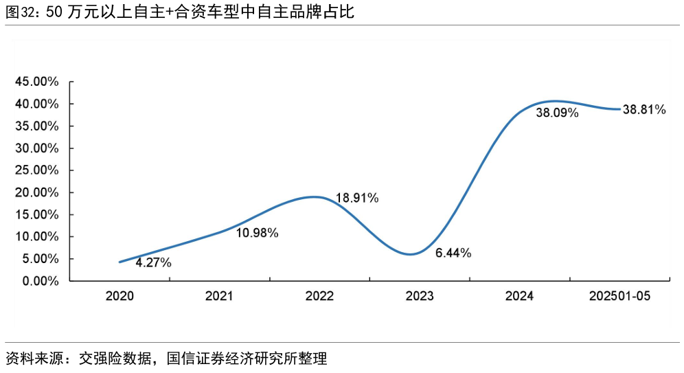 自主品牌高端化趋势显著,50万元以上的合资+自主品牌车型中,自主品牌占比高速增长。50万元以上的国产车中,自主品牌占比从2020年的4.27%增长至2024年的38%。自主品牌高端化趋势迅猛,以鸿蒙智行系旗下的问界M9为代表的50万元以上自主品牌车型,对豪华合资车型产生了巨大影响。一方面,自主品牌豪车不断攻取合资品牌份额;另一方面,为了应对自主品牌竞争,合资豪车通过折扣、下调指导价等方式降价,导致自主品牌在50万元以上占比快速提升。若以终端成交价为口径,预计50万元以上自主品牌占比将更高。