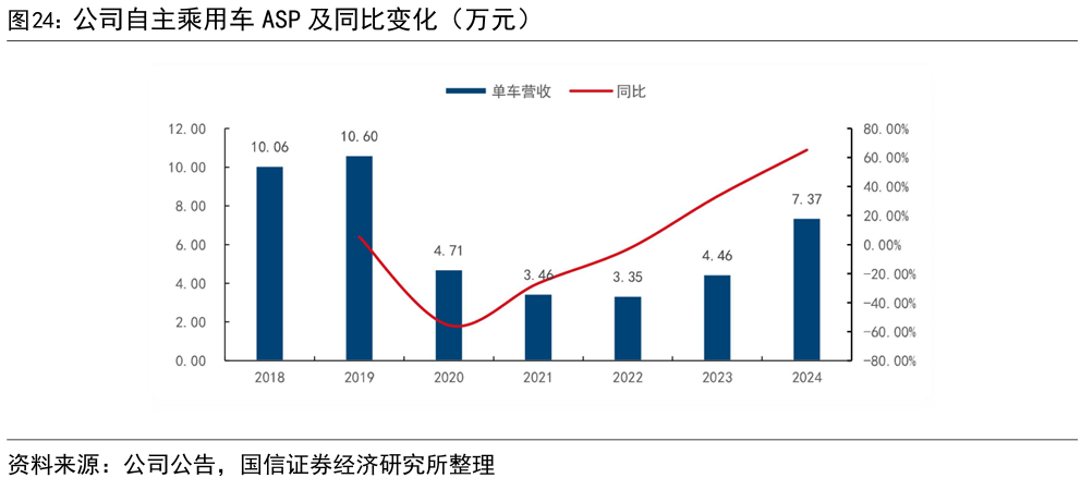 公司自主乘用车业务营收在2024年下滑,但单车营收显著提升。2020-2023年,公司自主乘用车销量和营收持续增长,但单车营收却处于近年来底部区间,甚至在2020-2022年,单车营收连续负增长,效率低下。2024年,尊界业务进入关键阶段,自主乘用车资源有限,销量大幅下滑,但由于产品结构改善和出海,单车营收同比提升65%,效率大幅提升。
