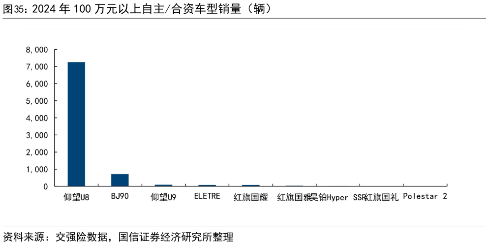100万元以上的自主/合资车型,主要是仰望系列,仰望U8在2024年销量为7254辆,合资车型基本绝迹。2024年,自主品牌的100万元以上超豪华车型,主要是BYD的仰望系列和红旗金葵花系列,其中仰望系列产生了一定销量规模,2024年全年销量7254辆。