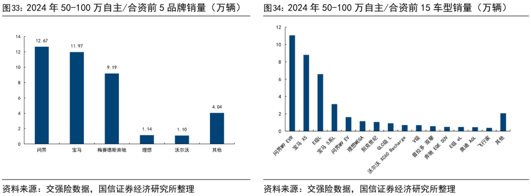 参考2024年全年销量,50-100万自主/合资车中,鸿蒙问界、宝马、奔驰三大品牌占了主要份额,整体以高端豪华车型为主。品牌上,50-100万自主/合资车中,2024年销量前三大品牌为问界、宝马、梅赛德斯奔驰,销量分别为12.67万辆、11.97万辆、9.19万辆,合计占了84.33%。车型上问界M9、宝马X5、奔驰E系列、宝马5系位列头部。值得注意的是,50-100万自主/合资主要车型中,宝马X5实际成交价较高,处于超豪华赛道边缘,其他车型几乎都处在高端豪华赛道,而宝马5系、奔驰E系列中多款SKU实际成交价早已跌破50万元。