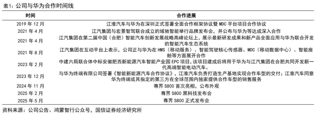 公司和华为深度合作,推出鸿蒙智行第四界——尊界系列,首款车型尊界S800于2025年5月30日正式上市。公司与华为的合作可以追溯到2019年,公司与华为签订全面合作框架协议以及MDC平台项目合作协议;随后,公司与华为的合作逐渐加深,尊界项目从车型规划到产能逐渐落地;尊界首款车型S800在2024年底首次亮相,并于2025年5月正式上市。