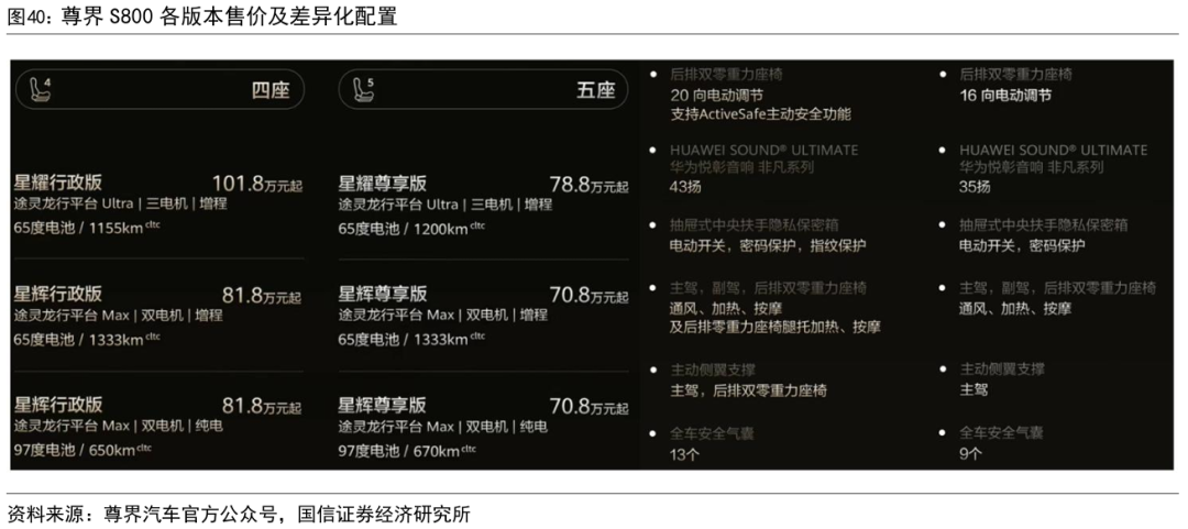 2025年5月30日,尊界S800正式上市,售价区间为70.8万元-101.8万元。尊界品牌由公司和华为共同打造,定位超豪华旗舰车型赛道,是鸿蒙智行家族的重要成员。历经2024年底的外观亮相和2025年2月的尊界黑科技发布会,本次发布会上,尊界品牌首发车型尊界S800正式上市,并开启预定。前599席预订用户可以参与先行者计划,在6月底开始实现交付,而正式的批量交付预计在今年8月底开始。各版本主要区别来自于电机个数、动力形式和豪华舒适相关的配置,而高阶智驾、智能底盘、智能座舱、AR-HUD、智慧大灯、网联通信等智能化配置做到了全系标配。