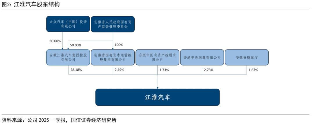 公司是安徽省属重要汽车行业资产。公司大股东为江汽控股,占比28.18%,江汽控股则有大众汽车和安徽省国资委分别持股50%,此外安徽省国资委还间接持有额外2.49%。安徽国资委之外,合肥市国资委、安徽省财政厅分别持有1.73%、1.67%。