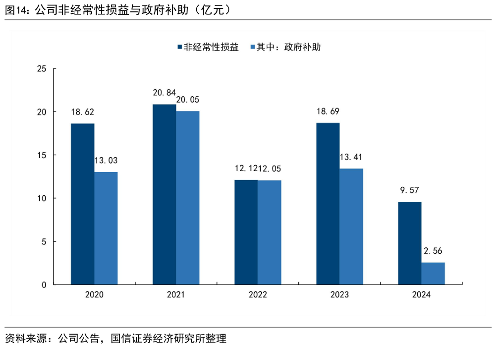 公司过往业绩中,非经常性损益有一定体量,其中大多来自政府补助,但在2024年政府补助大幅减少,对公司业绩影响已经有限。公司的过往业绩中,非经常性损益影响较大,导致公司的扣非后归母净利润与归母净利润相差巨大,其中在2021年,非经常性损益高达20.84亿元。过往的非经常损益,大多来自于政府补助,2020-2023年,公司获得政府补助均在10亿元以上,其中在2021年更是超过了20亿元。但是在2024年,公司获得政府补助大幅降低,为2.56亿元,对公司整体业绩影响有限。