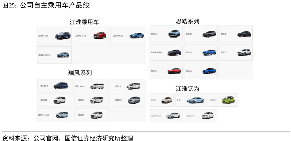 公司乘用车产品结构调整,划分为自主燃油、思皓系列、瑞风系列、江淮钇为四个板块。公司原有的乘用车产品线丰富,随着产品结构优化,产品线分类逐渐清晰。瑞风系列主要是MPV车型以及瑞风旗下星锐等VAN车型,目前在国内仍有一定市场;自主燃油车型目前向海外市场倾斜;钇为系列是公司自主研发的新能源品牌,专注小型车市场,处于开拓阶段。