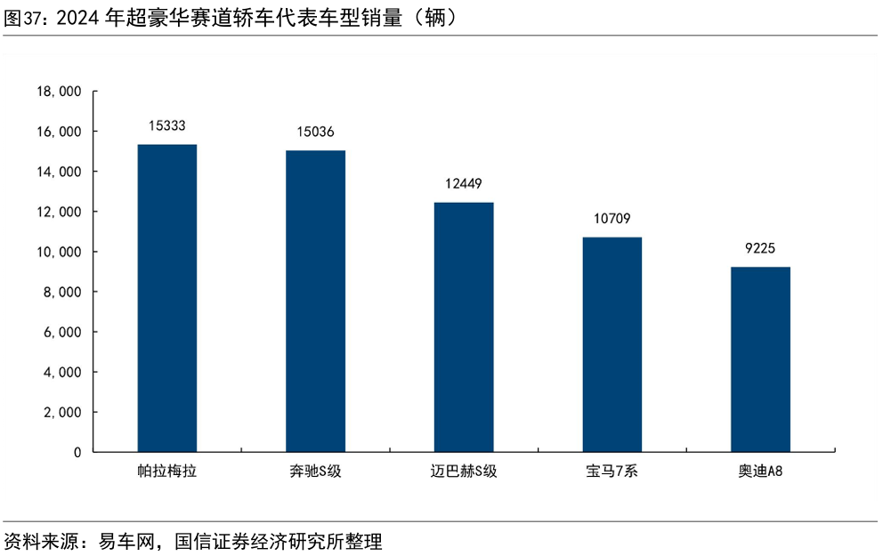 超豪华赛道的轿车车型代表为BBA的D级轿车和帕拉梅拉,奔驰S级及其迈巴赫版堪称行业标杆。2024年,奔驰S及迈巴赫版S合计销量2.75万辆;保时捷帕拉梅拉风格更为运动,销量1.53万辆;奔驰S、宝马7系、奥迪A8、帕拉梅拉合计销量6.28万辆。此外,如宾利、劳斯莱斯等顶奢品牌,以及AMG、M power等BBA官方改装车型未进入销量榜,代表车型之外仍有少量超豪华轿车市场空间。