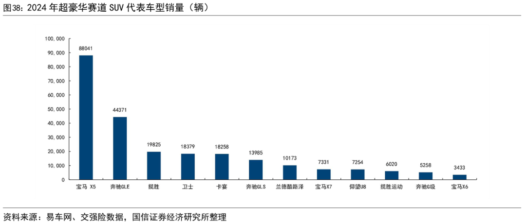 超豪华赛道的SUV市场规模比轿车更大,代表车型区别大,宝马X5曾是百万级SUV标杆,国产化后价格降低但销量可观。超豪华赛道的SUV车型风格更多,有宝马X5、奔驰GLE、卡宴等偏家用、运动的车型,也有路虎卫士、奔驰G级、丰田兰德酷路泽、仰望U8等硬派越野车型,以及路虎揽胜等具备一定行政功能的车型。宝马X5国产化之前是百万级SUV的标杆车型之一,国产化之后售价降低,但销量可观,2024年在问界M9的冲击下,仍有8.8万辆销量。选取的12款代表车型涵盖自主、合资、进口车型,2024年合计销量24.23万辆,超豪华SUV市场规模远大于轿车。