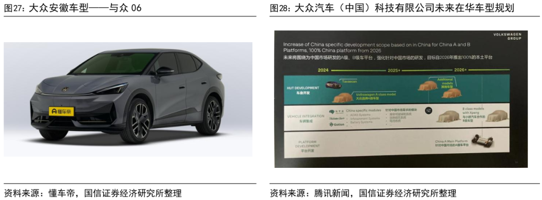 公司持有大众安徽25%股权,大众安徽在2024年承受了较大亏损,对公司投资收益有较大影响。大众安徽在2024年发布了首款车型,即采用大众金标的“与众”系列子品牌,首款车型与众06。根据大众集团的规划,预计在2026年起,大众将在国内推出本土平台,以及包含与小鹏汽车合作车型在内的多款车型。新车型的研发、生产有望落地大众安徽。