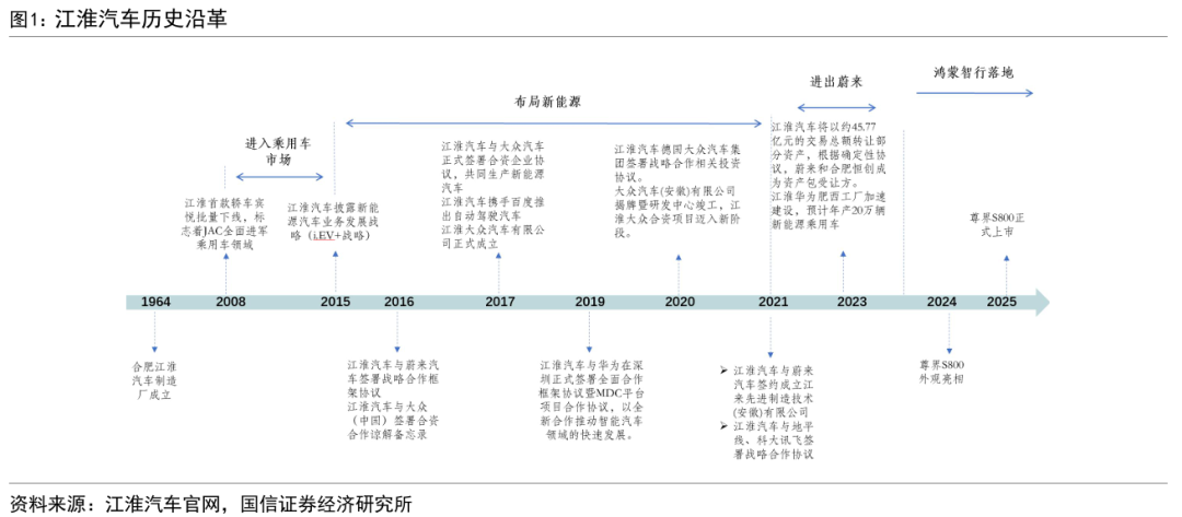 公司成立于1964年,当前处于历史新篇章。公司成立于1964年,有60年的历史;公司始于商用车和底盘业务,于2008年正式进入乘用车领域,但没有抓住国内乘用车千人保有量提升的历史机遇;公司在2015年起布局新能源汽车,先后与大众集团、蔚来汽车合作;公司与华为深度合作,成立鸿蒙智行系列子品牌“尊界”,首款轿车S800于2024年底亮相,于2025年正式发布。