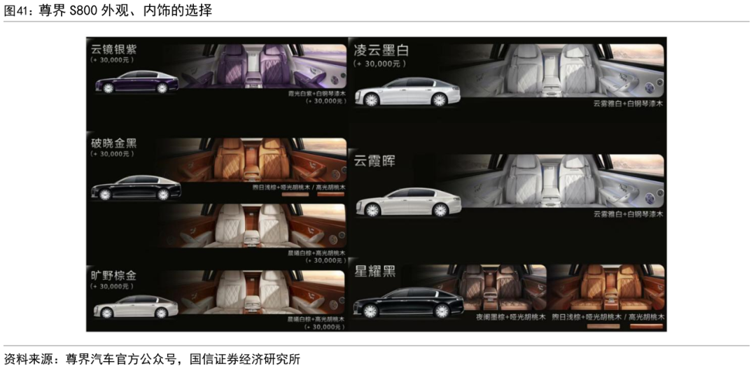 外观内饰选配上,尊界S800提供了六种车身颜色、五种内饰配色、三种轮毂以及三种实木内饰的选择。同时,提供了电子后视镜选装,以及在相对低配车型上选配星空顶、隐私巨幕、隐私玻璃等行政车型配置。