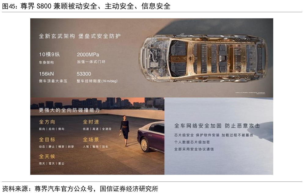 安全配置上,凭借车身用料、智能驾驶、智能网联等方面的优势,尊界S800兼顾被动安全、主动安全和信息安全。尊界S800采用全新玄武车身架构设计,1500MPa+热成型钢占比超24%、超高强钢与铝含量占比超92%,采用中汽中心C-NCAP五星标准与中保研C-IASI 3G+标准设计。10横9纵车身架构,2000MPa加强一体门环,侧车顶最大承压达16吨,整车扭转刚度达53300N·m/deg。尊界S800搭载华为巨鲸电池平台2.0,底部五层硬核防护,高安全热电分离架构,双大面液冷板、热电分离防高压短路,降温速率提升2倍。尊界S800全车网络安全加固防止恶意攻击,芯片级安全保护软件安装,加载过程不被篡改,全部采用安全协议通信。核心部件防伪检测,部件专属身份与车辆1对1绑定。