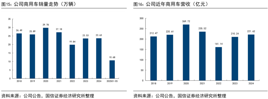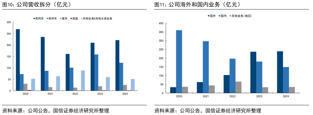 公司商用车业务营收和产品销量在2023/2024年回升。公司商用车业务在2020年达到近年来高点269.72亿元;2021年、2022年连续下滑,2022年仅为161.14亿元;后续公司成功把握出海趋势,以及通过扩品类,在2023/2024年逐渐恢复商用车业务体量。