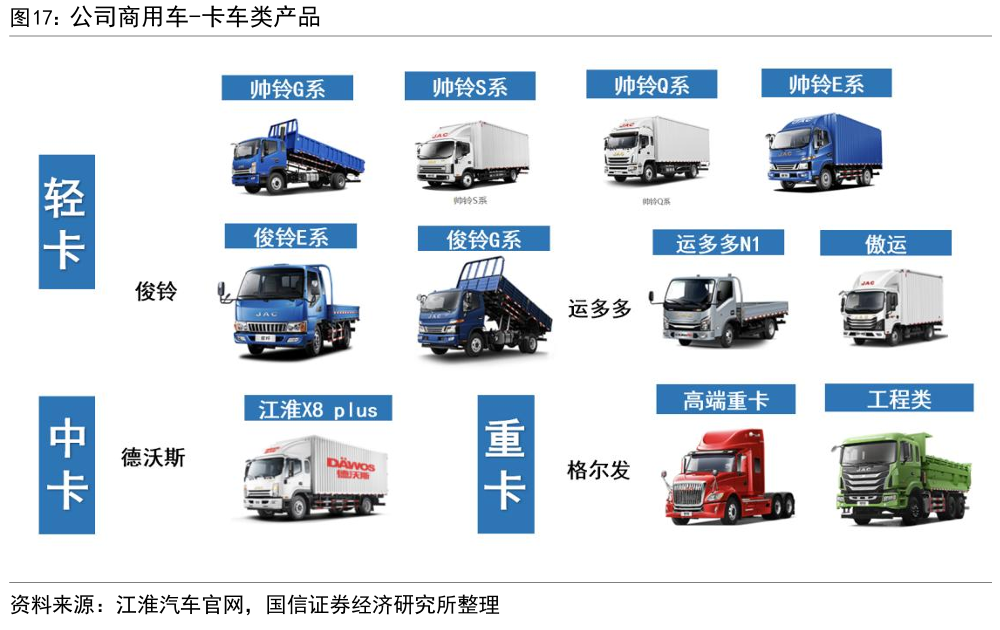 商用车核心产品线包含轻中重卡,其中以轻卡产品为主。公司的优势产品以帅铃、俊铃系列轻卡为主,也布局有重卡、中卡产品。此外,底盘等非完整车辆、客车也有产品布局。