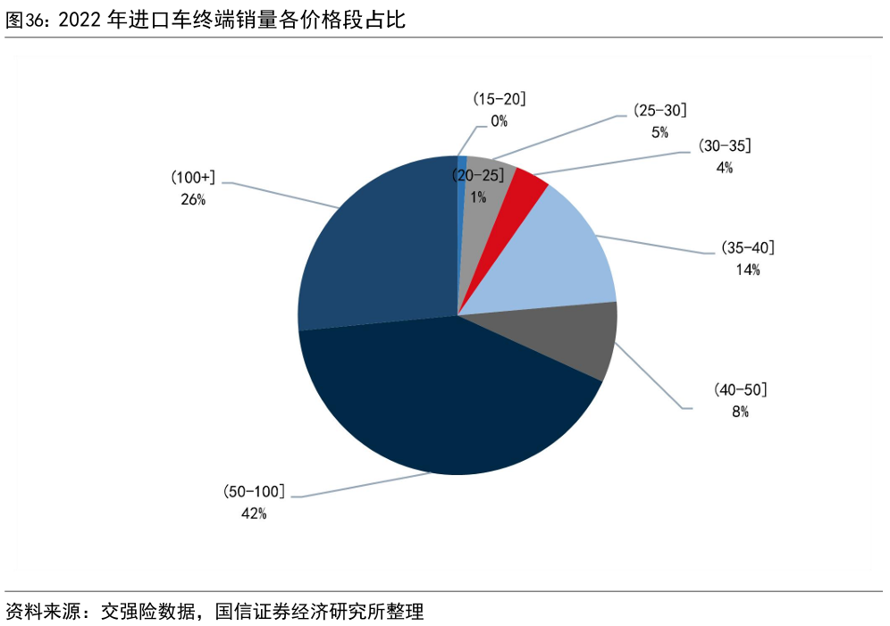 进口车市场近年正在收缩,但是目前仍有一定规模,且以50万元以上车型为主。根据乘联会数据,中国进口车进口量从2017年的124万台持续以年均8%左右下行,到2023年为80万台,2024年全年汽车进口70万台。参考2022年进口车交强险数据,2022年我国进口车上险量为76.83万辆,其中50-100万元车型上险量为31.92万辆,占比41.55%,100万元以上车型上险量高达20.34万辆,占比为26.47%,二者合计52.26万辆,占比超过68%。