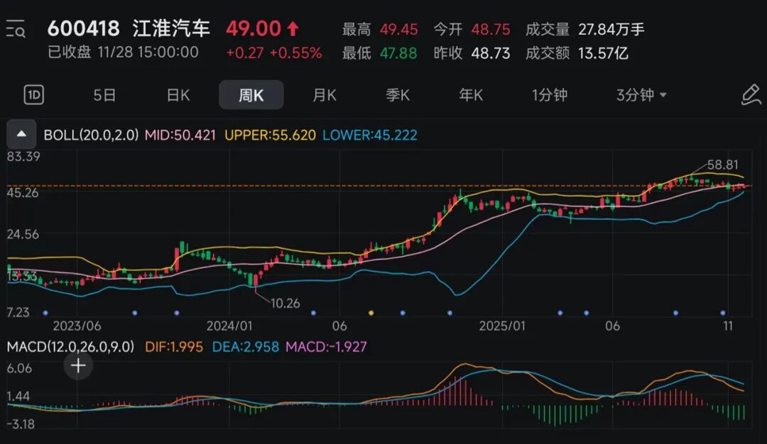 不过在资本市场, 江淮汽车 今年股价却是连创新高;截至11月28日收盘,报收49元/股。