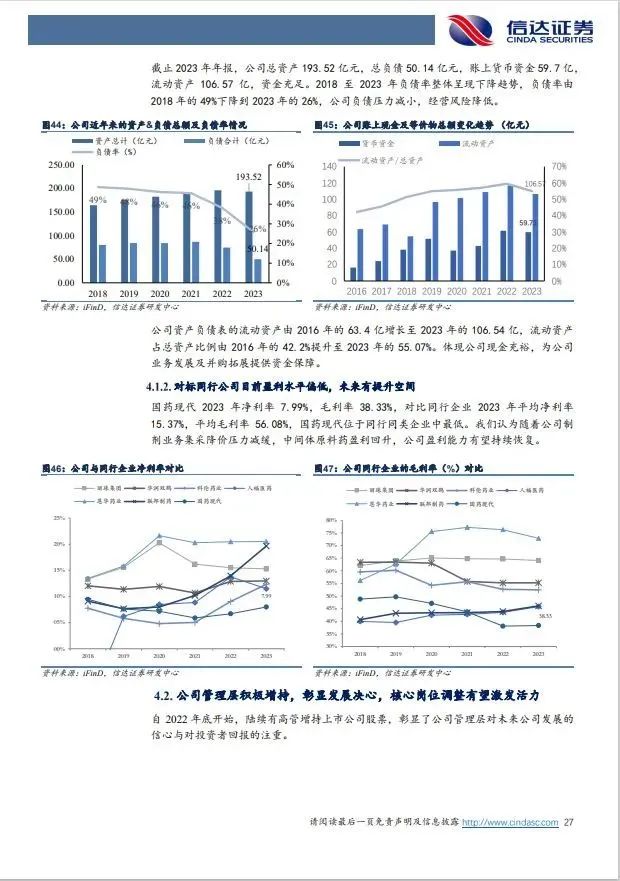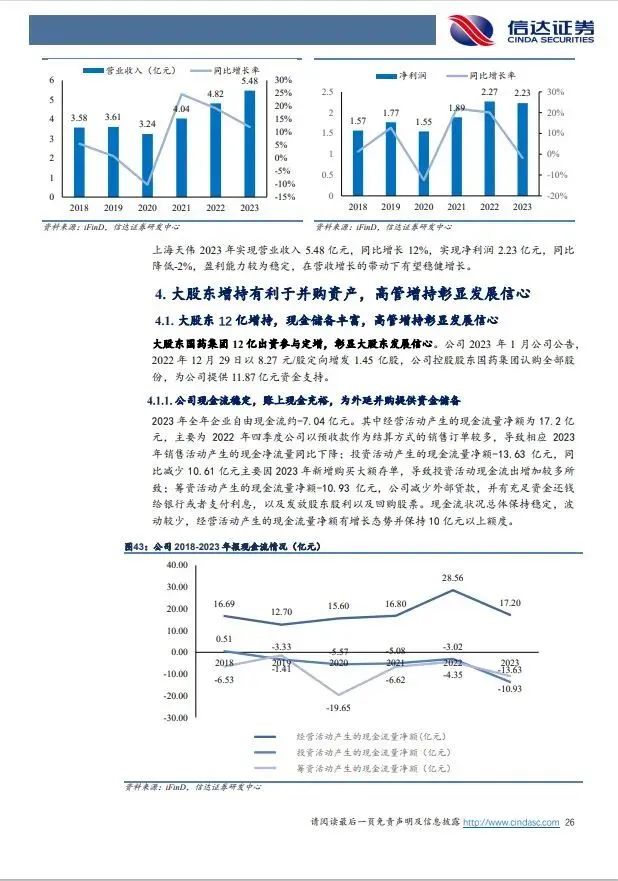 (3)大股东大额资金参与增发,高管增持彰显发展信心,账上现金充裕有利于业务拓展及外延并购。2023年大股东12亿参与增发,公司账上现金充裕,西南药业(太极集团子公司)及国药国瑞药业(国药股份子公司)主营化学药制剂,我们认为国药集团有望推动资产重整梳理。④央企改革机制理清,2022Q3以来公司管理层陆续更换,在央企“一利五率”考核要求下,有望盘活组织激化团队积极性,提升公司盈利能力;⑤2023年公司扣非利润6.83亿(yoy+24%),净利率7.99%,低于制药工业同类可比上市公司15.37%的平均水平,盈利能力有提升空间。
