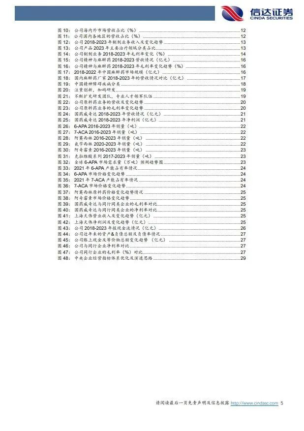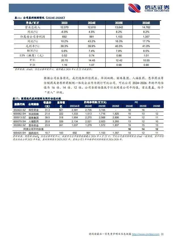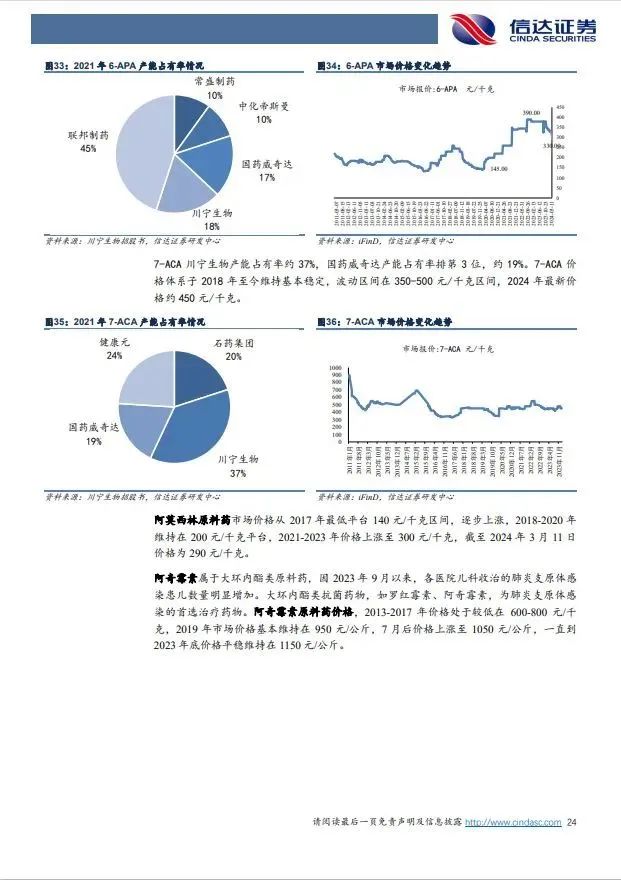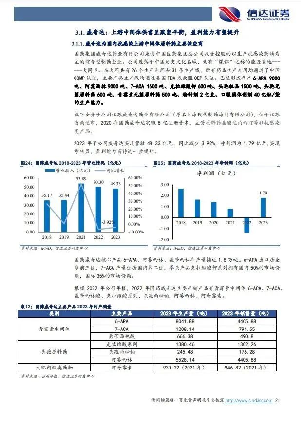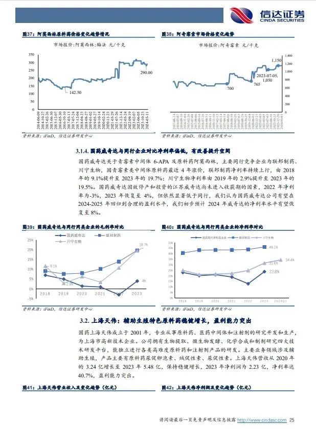 (2)上游中间体原料药业务,抗感染中间体原料药竞争格局较好,盈利能力有望提升,生殖特色原料药稳健增长:①全资子公司国药威奇达主营抗感染类原料药中间体6-APA、克拉维酸、阿莫西林等抗感染药物,公司近年来主要品种销量整体保持平稳,主产品公司市场份额居前,其中6-APA,阿莫西林、阿奇霉素等产品价格自2019年以来市场价格持续走高,我们认为市场经过多年的充分竞争和淘汰,目前基本形成稳固的少数寡头竞争格局,价格体系有望维持现有的动态平衡,如其中6-APA已形成三寡头竞争格局,价格从2019年最低145元/千克的价格,持续上涨,到2022年底最高达到390元/千克,2024年3月份最新价格为330元/公斤。国药威奇达2022年因短期停产亏损,2023年扭亏为盈,利润为1.79亿,我们认为后续盈利能力有望逐步提升;③控股子公司上海天伟主营辅助生殖特色原料药,2023实现营收5.48亿元,净利润2.23亿元,盈利能力突出,有望稳健增长。
