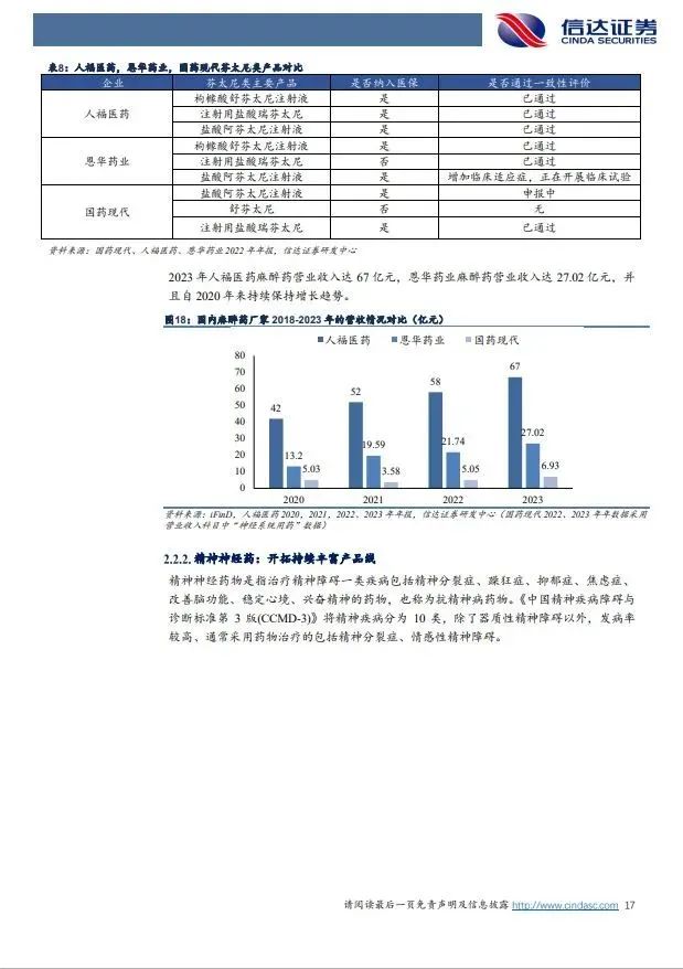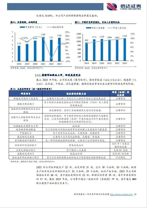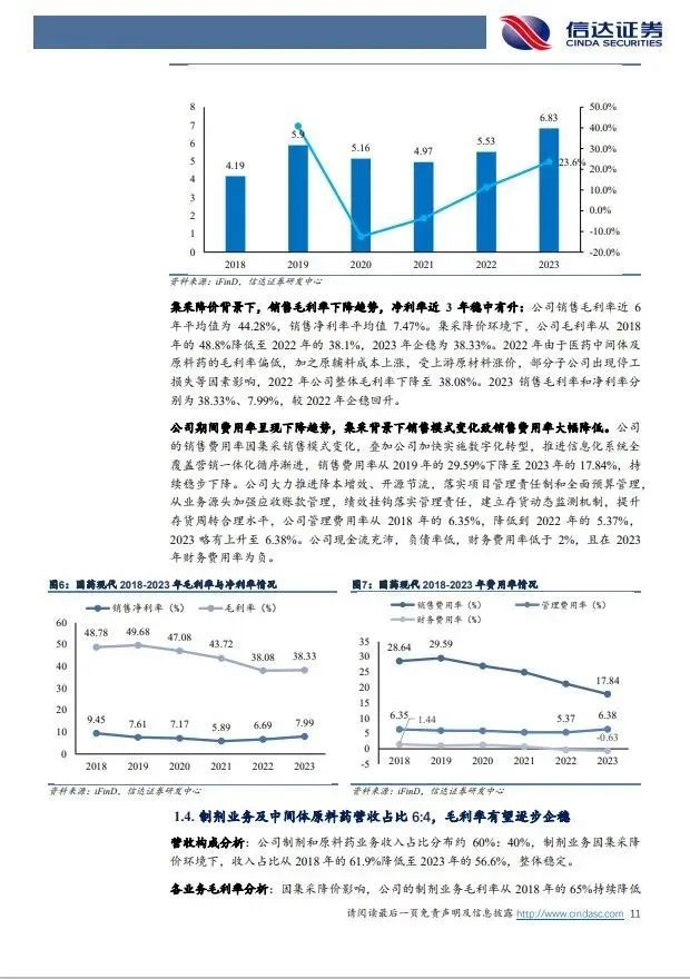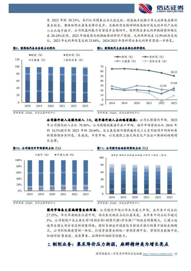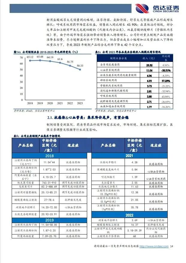 (1)制剂业务:仿制药集采降价压力渐缓,精麻类制剂为增长亮点。公司制剂业务2023年收入68.34亿,营收占比56.62%,主要有抗感染类、心血管类、泌尿生殖系统类、精神神经麻醉类、骨骼肌肉类、消化道及代谢类等。2018年以来国内仿制药集采降价,公司拳头产品头孢克肟、硝苯地平控释片等大品种降价导致2018年至2023年公司制剂总规模维持在68-81亿体量,毛利率由65.12%下降至50.33%,同时公司整体销售费用率从2019年的29.6%下降至2023年的17.84%,集采降价承压下盈利保持整体稳定。我们认为受益瑞芬太尼、盐酸米那普仑片等精麻药物快速增长,制剂业务有望企稳。